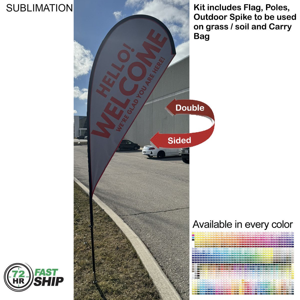 72-Hour Fast-Ship 9ft Small Tear-Drop Flag Kit — Full-Color Double-Sided Graphics + Spike Base & Carry Bag